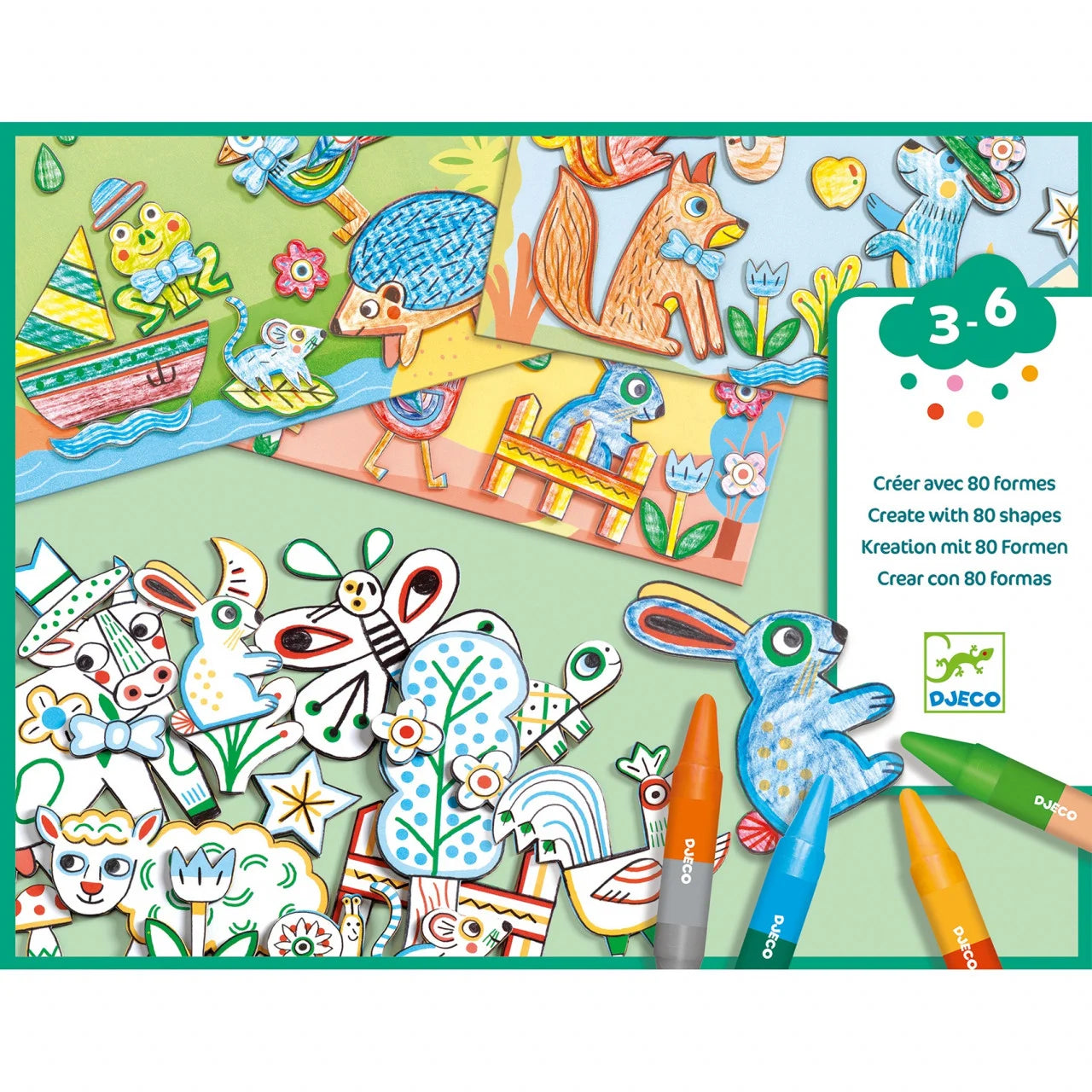 Setul conține 6 planșe fundal, 10 coli cu diferite personaje și obiecte (circa 80 de piese individuale) care se pot desena și apoi decupa foarte ușor, 1 lipici stick, 4 creioane cu capăt dublu (8 culori).
