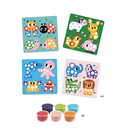 Conține: 4 planșe cu diferite animalee, 6 recipiente cu plastilină colorată.