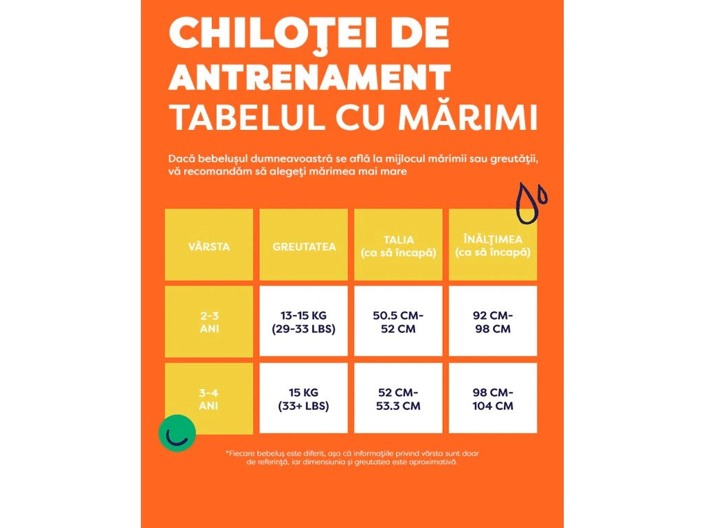 Chiloței de antrenament la olița super absorbanți, sunt pasul perfect spre a renunța la scutece și a trece la chiloței obișnuiți.