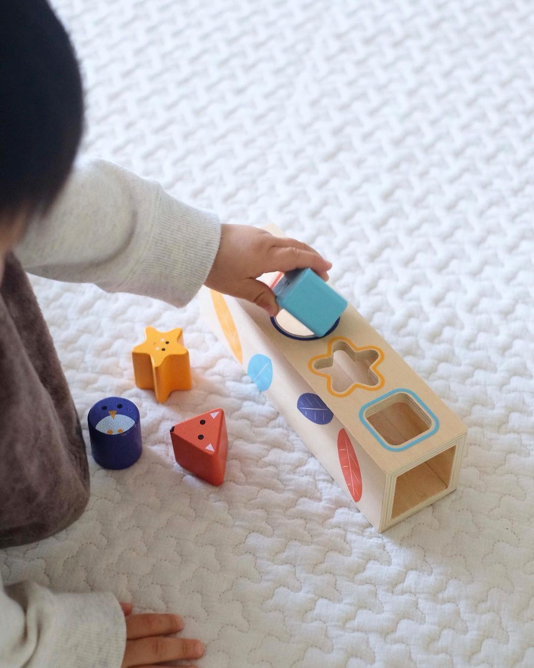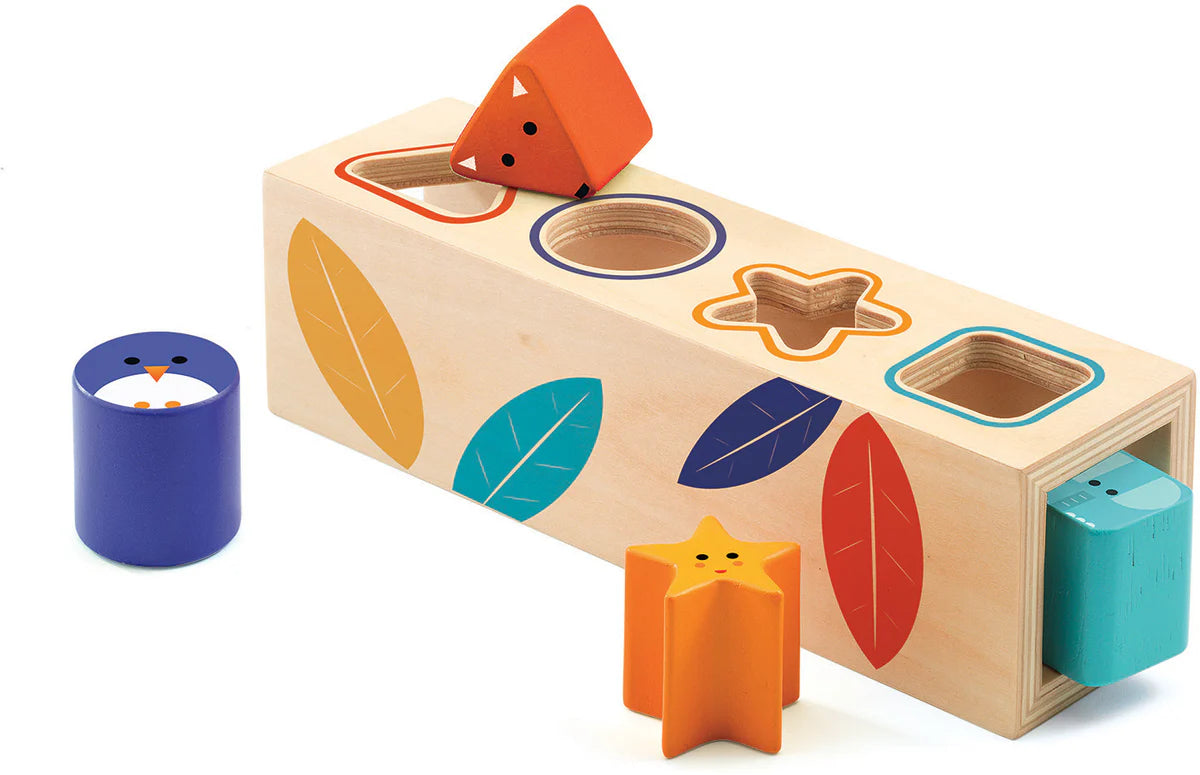O cutie de sortare realizată din lemn natural cu culori clasice pentru ca cei mici (de la 18 luni în sus) să învețe despre forme. Copiii se pot bucura să pună cele 4 piese (dreptunghi, triunghi, cerc și stea) în lăcașul potrivit. Pot recupera piesele prin partea laterală a cutiei și pot începe distracția de la capăt.