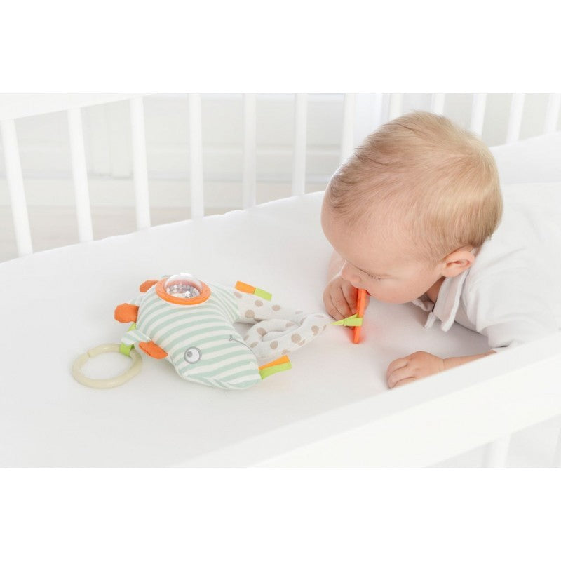 Acest cameleon drăguț are tot ce e necesar pentru dezvoltarea timpurie a bebelușului tău. Zornăitoarea cu mărgele scoate sunete nebunești atunci când îl agitați și are câteva fașii de panglică pentru a face învățarea culorilor mai distractivă. De asemenea, ajută dentiția bebelușului, având o jucărie de silicon inscripționată Dolce, de culoare portocalie, atașată de coada cameleonului.