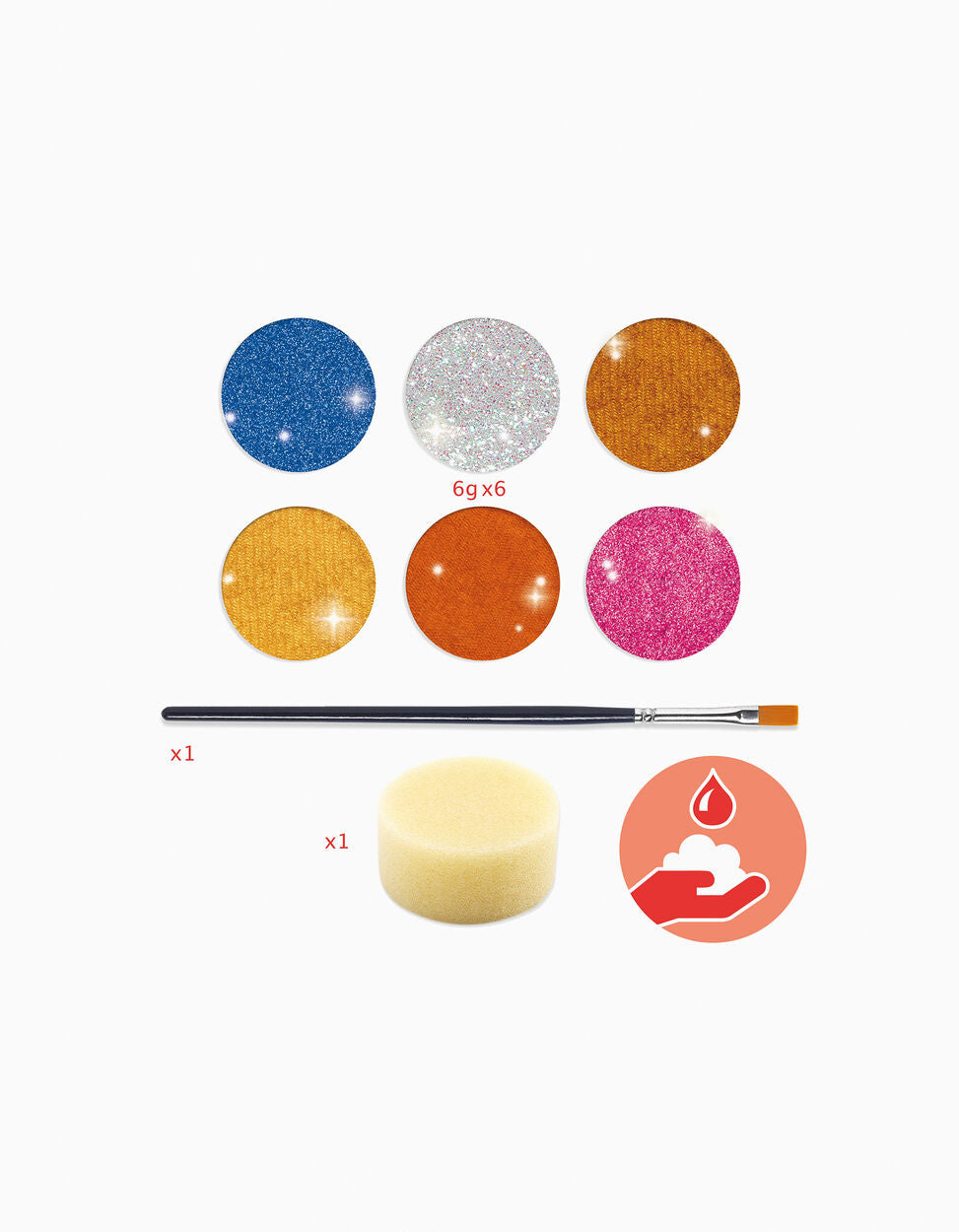 Conține: 6 pastile cu culori non-alergice, 1 burete (35 mm diametru), 1 pensulă.