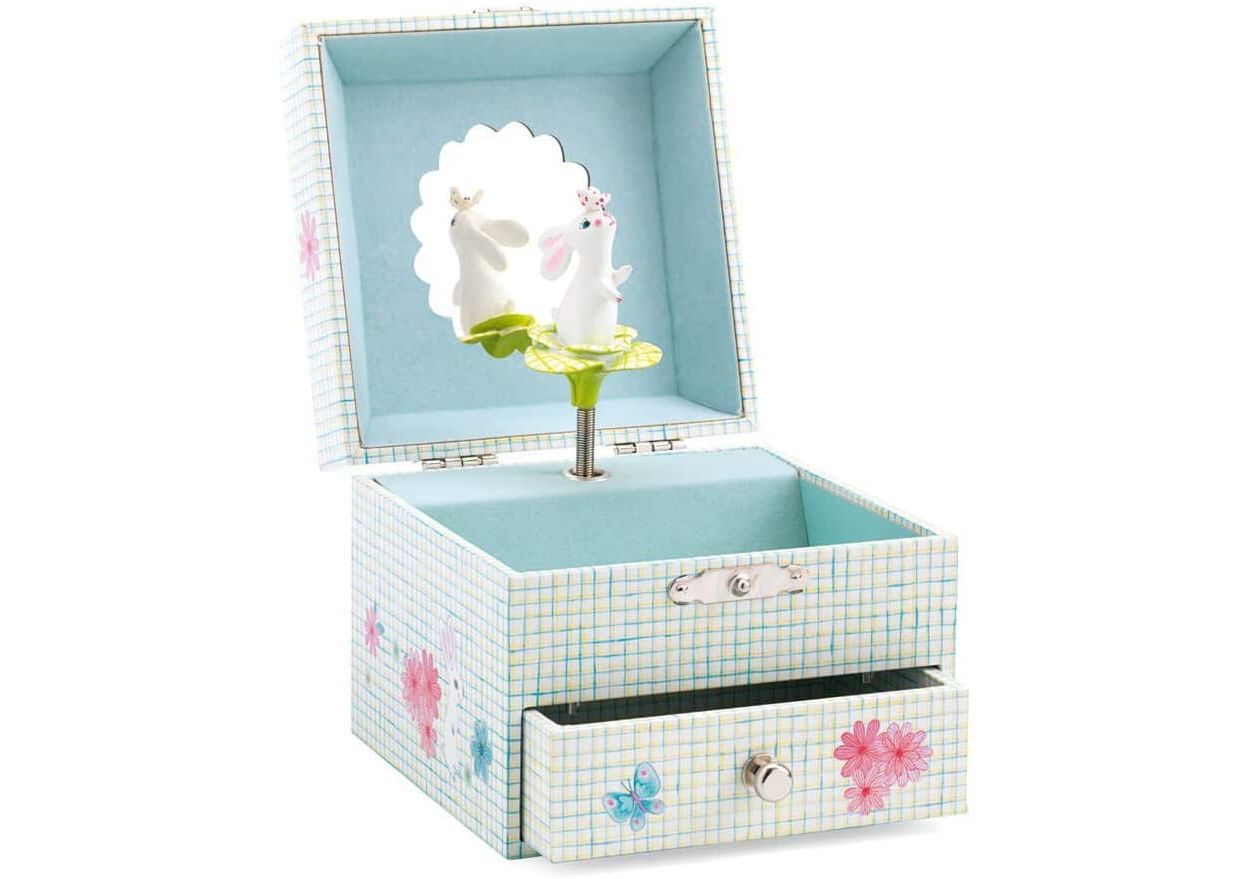 Cutie muzicală cu sertar pentru a păstra bijuterii și obiecte secrete. Întoarceți cheița, deschideți cutia și ea prinde viață: o iepuraș sculptat delicat se rotește, reflectat într-o oglindă ovală.
