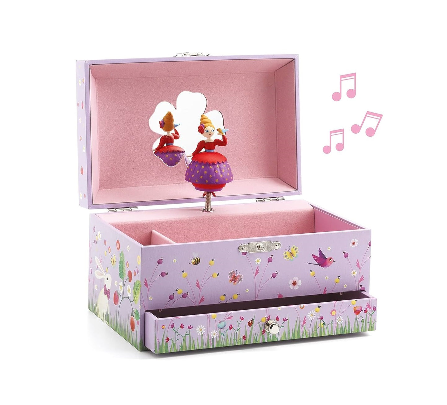 Cutie muzicală cu sertar pentru a păstra bijuterii și obiecte secrete. Întoarce cheița, deschide cutia și vei fi surprins! O prințesă colorată se rotește, reflectată într-o oglindă floare.