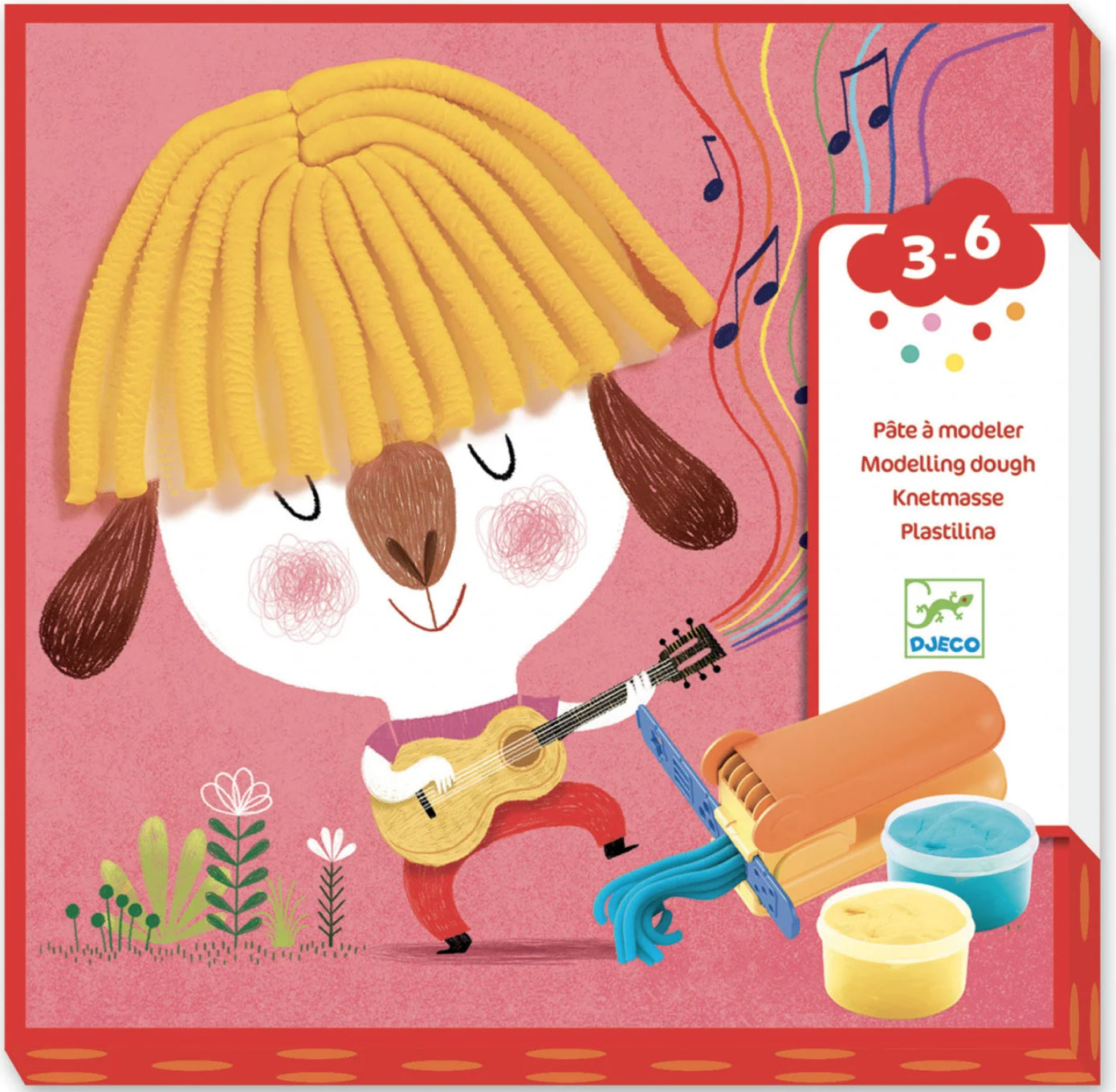 Conținut: 4 recipiente de 80 gr pastă de modelat, 4 planșe plastifiate ilustrate (dimensiune 20x20 cm), o presa, o bară cu 2 modele, rotiță cu mâner pentru tăiere.