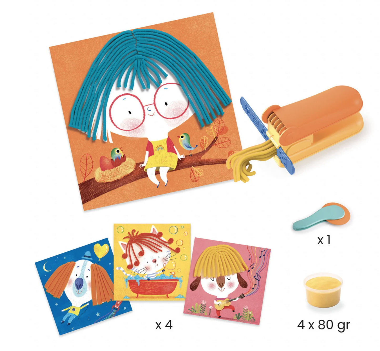 O presă și 2 modele pentru a decora personajele de pe planșe cu cele mai trăznite coafuri.