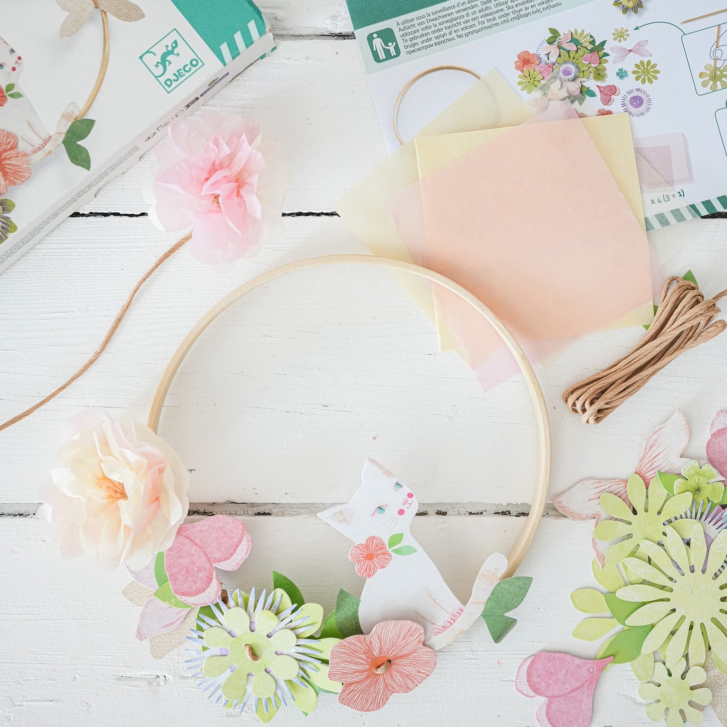 Conținut: inel de bambus (18 cm), 20 de foi de hârtie de mătase (2 nuanțe), 3,5 m șnur de rafie, 59 de modele ilustrate preperforate, set de instrucțiuni pas cu pas.