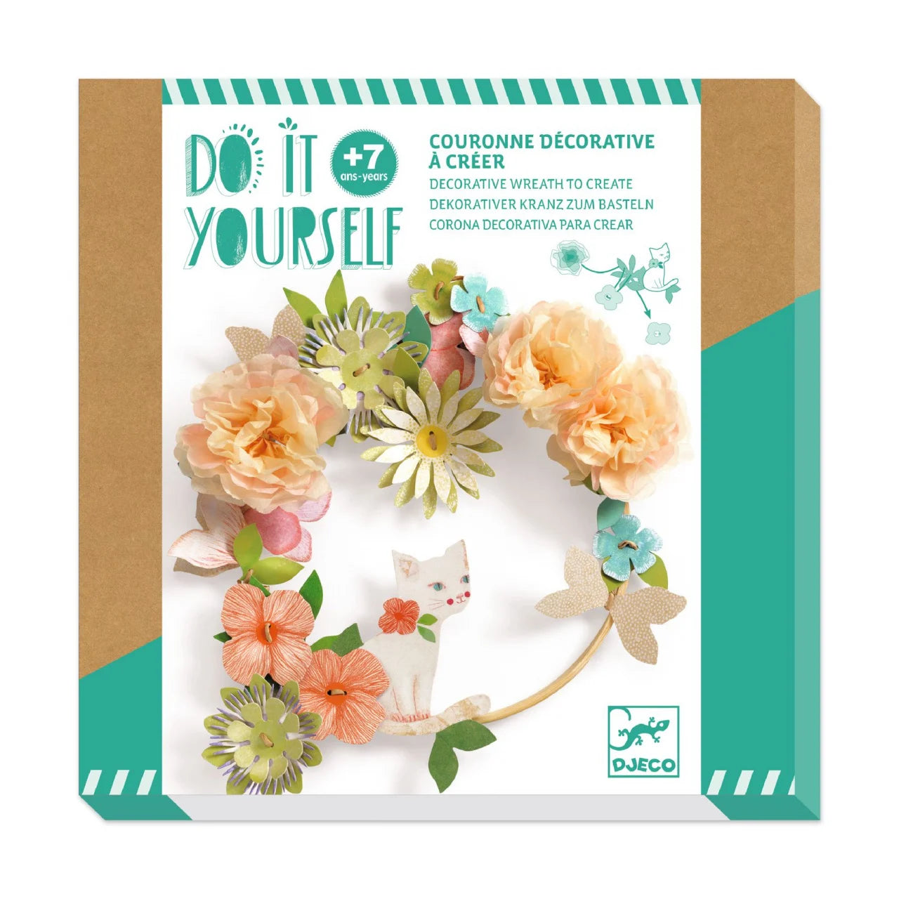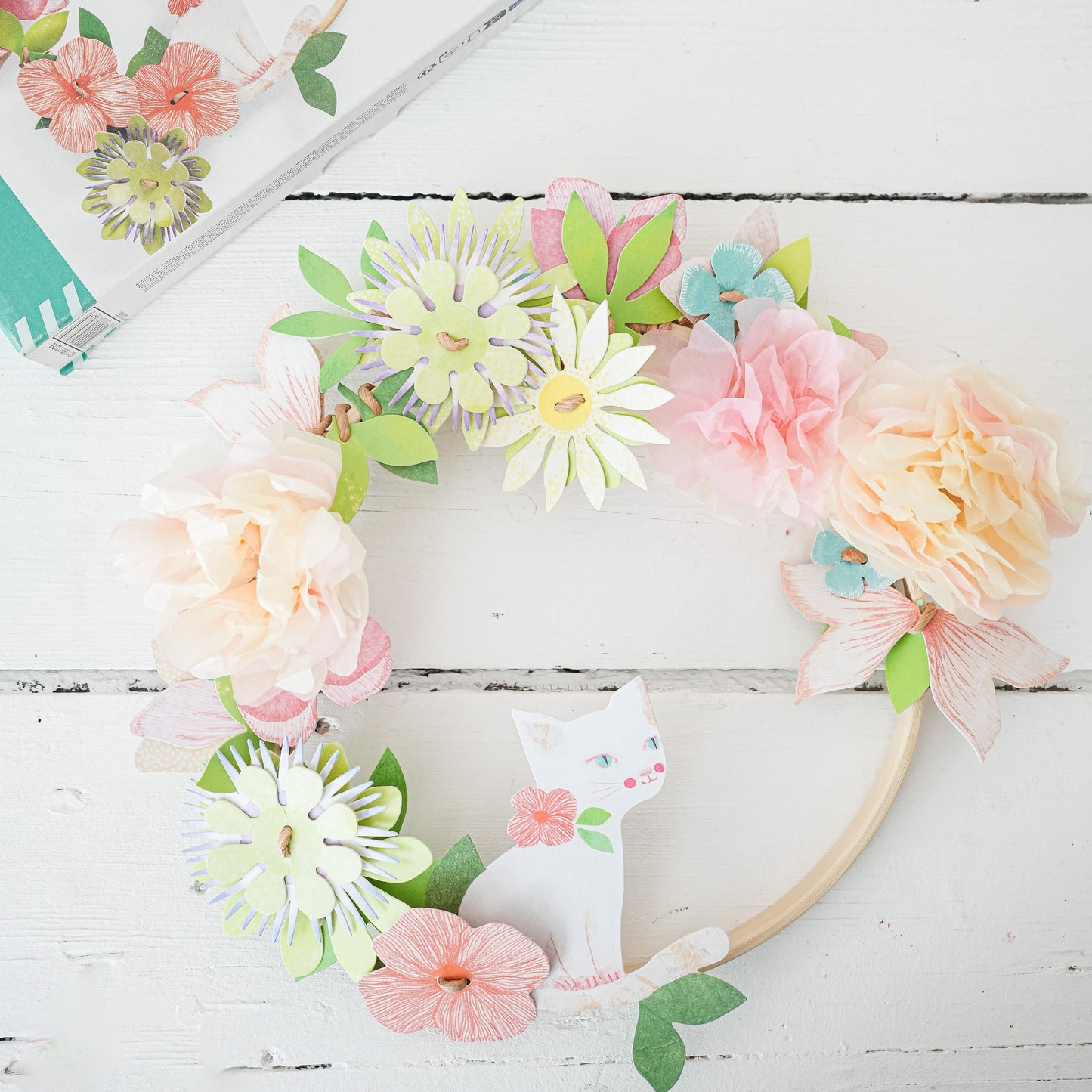 Un kit creativ complet pentru a realiza o decorație florală. Vei învăța cum să faci flori din hârtie de mătase, pe care le poți asambla apoi cu celelalte modele pentru a crea o coroniță decorativă care să împodobească ușa sau camera.