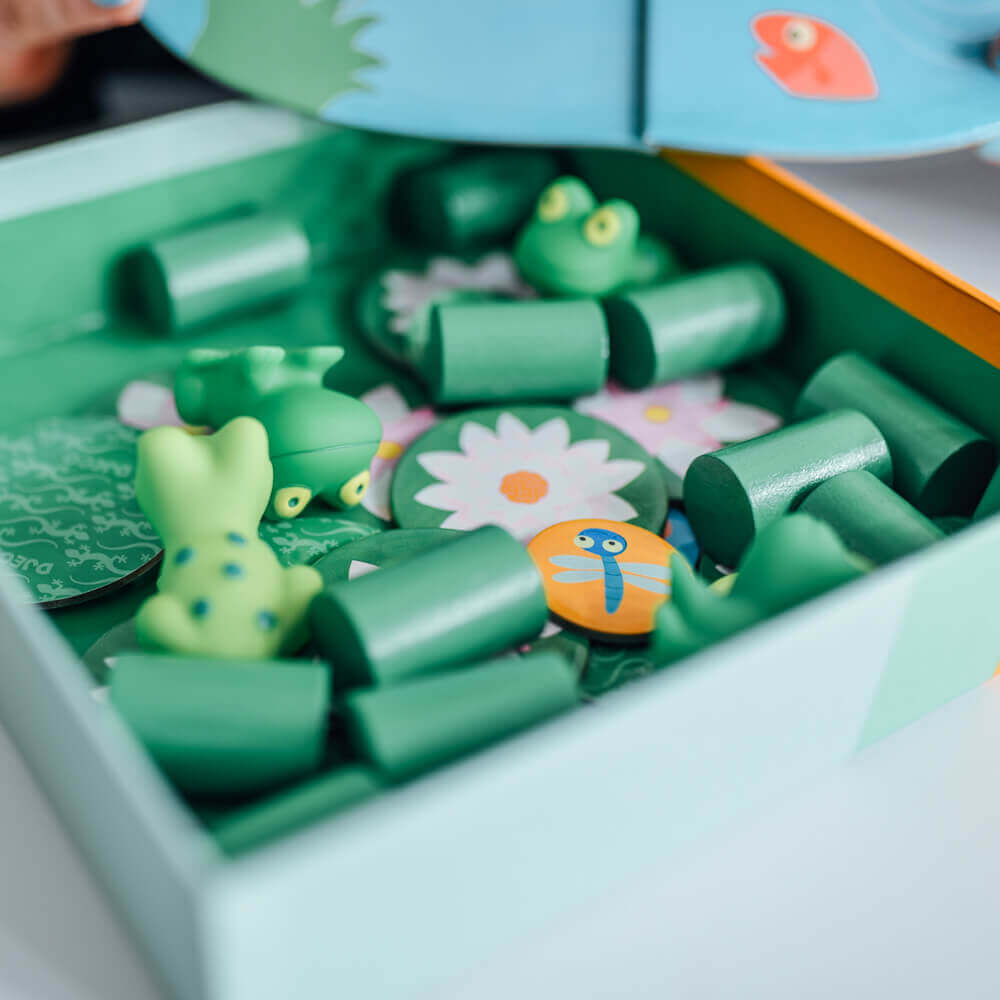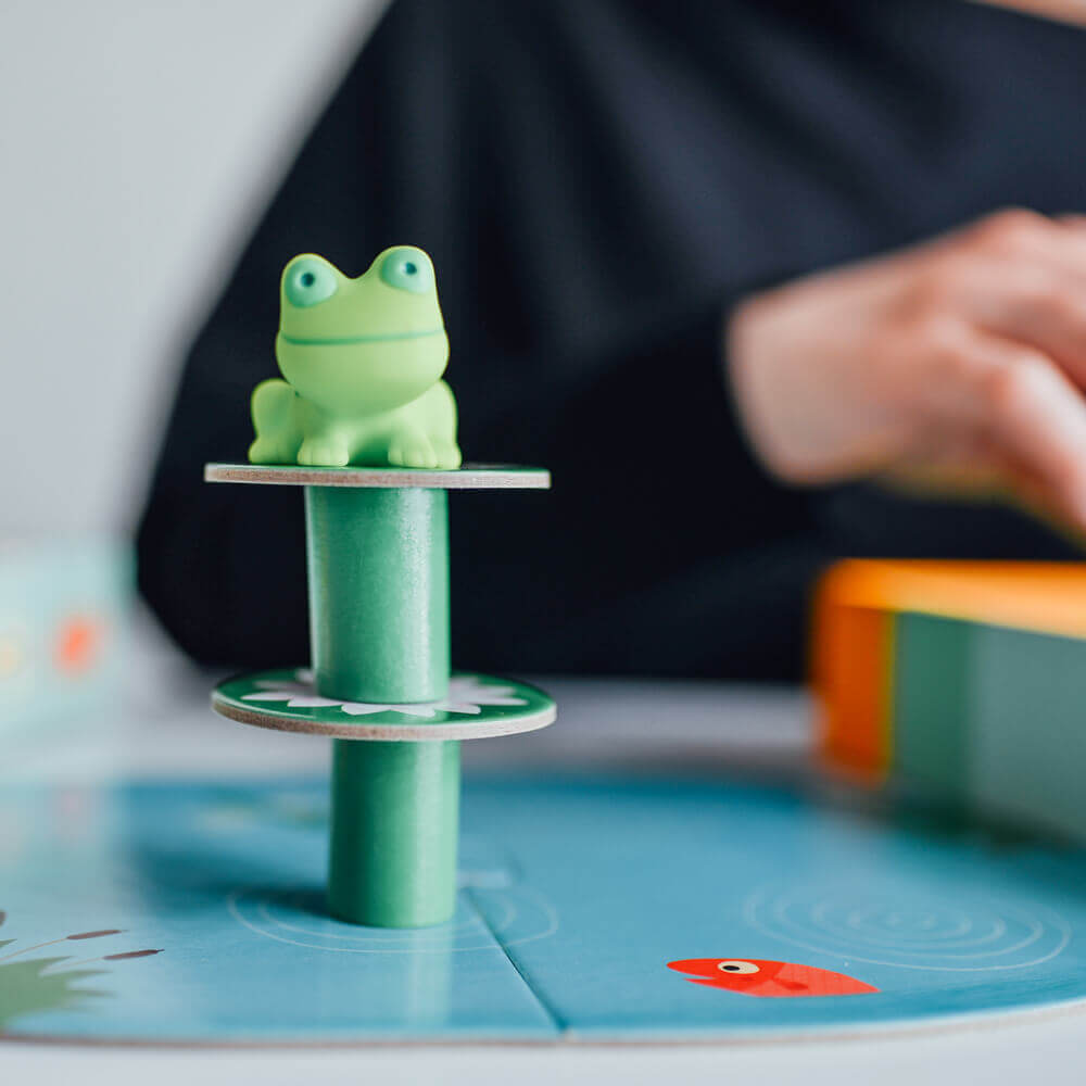 Broscuțele trebuie să stea în echilbru pe nuferii tot mai înalți. Un joc de îndemânare și cooperare conceput special pentru cei mici, cu reguli simple și amuzante; încurajează comunicarea între copil și părinte în timpul jocului, jocul cu partener.