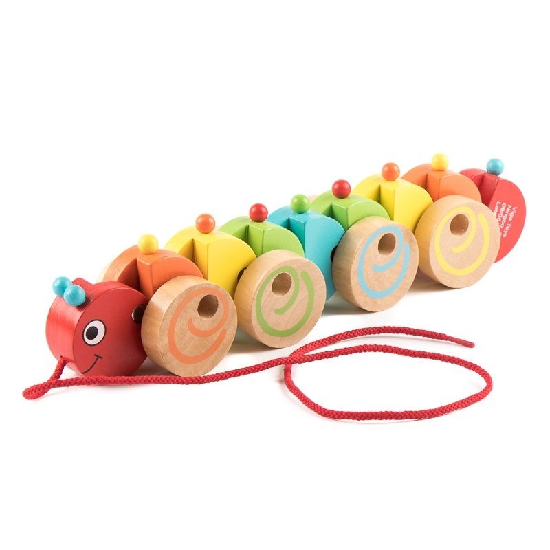 Jucărie de tras pentru copiii micuți, cu roți și sforicică, sub formă de omidă mobilă, alcătuită din mai multe bucăți diferit colorate.