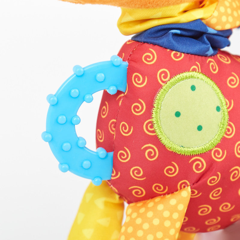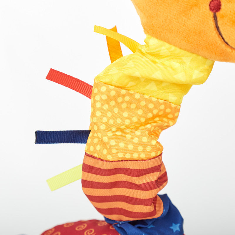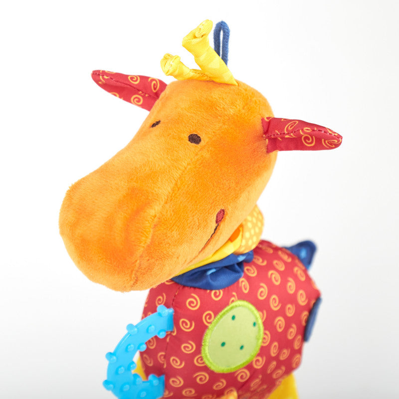 - Activități interactive: Girafa include diverse elemente tactile și sonore care stimulează simțurile copilului, precum oglinzi mici, sunete sau texturi diferite.