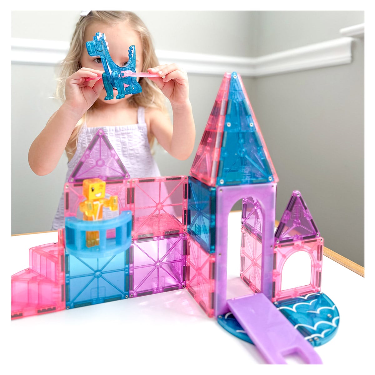 Creează-ți propriile aventuri de basm cu setul MAGNA-TILES Castle. Conține 25 de piese magnetice, ce oferă un potențial nelimitat de povestire, construcție și distracție și o serie de piese inedite: un pod mobil, o scară în spirală, un balcon și figurine, precum și plăci Glitter pentru un strop de strălucire!