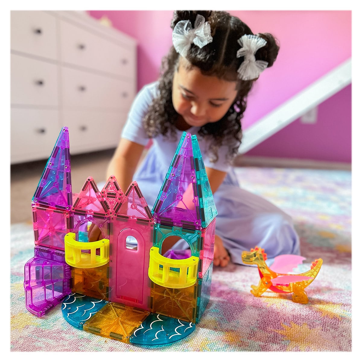 Acest set magnetic de construcție permite copiilor să își creeze propriile aventuri de basm, oferind un potențial nelimitat de povestire și distracție, cu o serie de piese inedite: un pod mobil funcțional, scări în spirală, piese pentru balcon, piese microMAGS și plăci cu sclipici pentru un plus de farmec și strălucire!