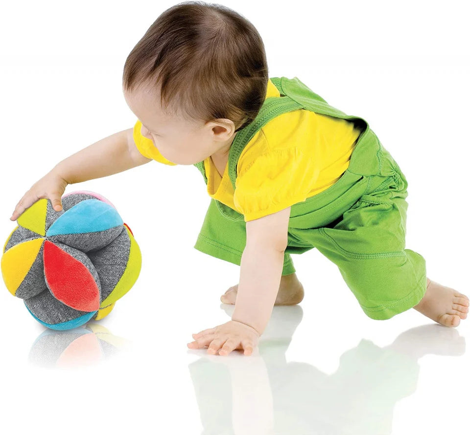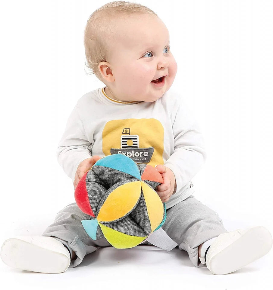 Fabricată dintr-o țesătură moale, cu culori vibrante și contrastante, mingea este ușor de manipulat, stimulând simțul tactil, dexteritatea și coordonarea mișcărilor.
