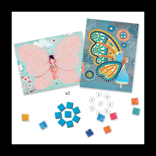 Două imagini mozaic. Prin lipirea pieselor mici se formează 2 tablorui cu fluturi prietenoși.