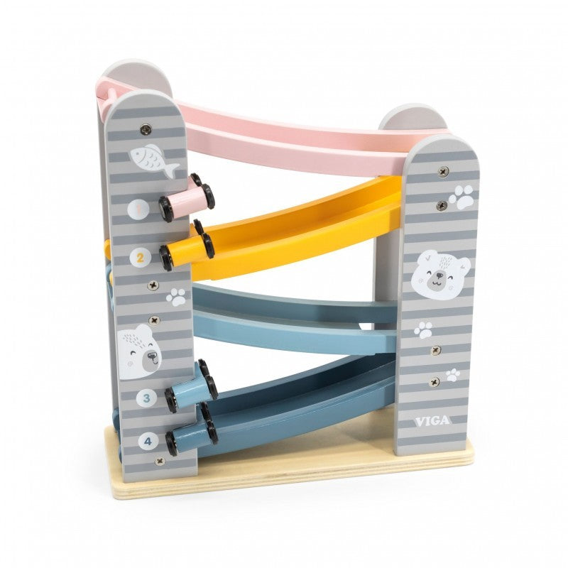 Pod zig zag cu masini Copiii se vor bucura vazand masinutele cum se mută de-a lungul acestei piste din lemn click-clack. Puneți o mașină în partea de sus a pistei și priviți cum se deplaseaza pe patru niveluri colorate. Puteți împinge pe rand cate o mașină, sau le puteți unul după conecta in sir, una dupa alta. Include o pistă de lemn și 4 mini-mașini. Micuții se vor distra foarte bine privind aceste mașini în drumul lor pe podul zig zag din lemn! De asemenea, sunt prevazute 4 locuri de parcare pentru masinute.
