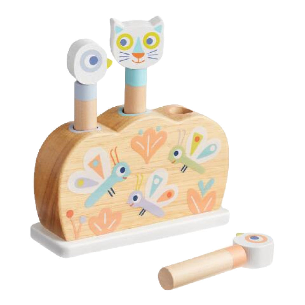 Jucărie pop-up din lemn natural în culori pastelate pentru cei mici cu vârsta de peste 12 luni.