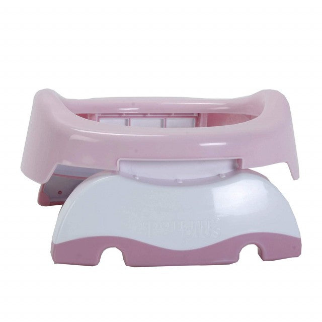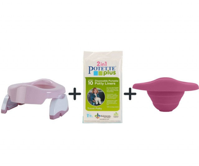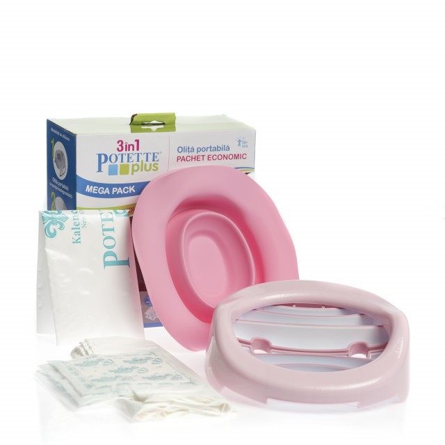 Acest pachet contine: olita portabila Potette Plus 2 in 1 culoare roz + liner reutilizabil Potette Plus culoare roz + 10 buc pungi biodegradabile de unica folosinta.