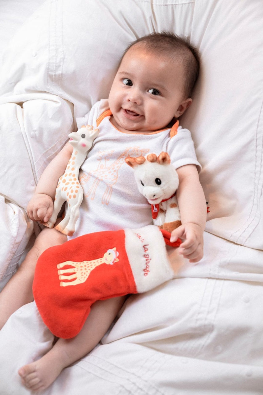 Setul "Primul meu Crăciun alături de girafa Sophie" include celebra jucărie din cauciuc natural girafa Sophie (este prima jucărie a bebelușului care îi dezvoltă toate simțurile: văzul, auzul, gustul, atingerea și mirosul), un pluș baby Sophie (14 cm) (cu o mărime ideală pentru ca mâinile mici ale bebelușului să o mângâie și să o apuce) și o șosetă pt cadouri cu imaginea lui Sophie!