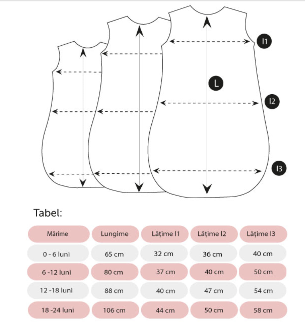 Este potrivit pentru bebeluși între 12 și 18 luni, însă colecția cuprinde și mărimi pentru 0-6 luni, 6-12 luni și 18-36 luni.