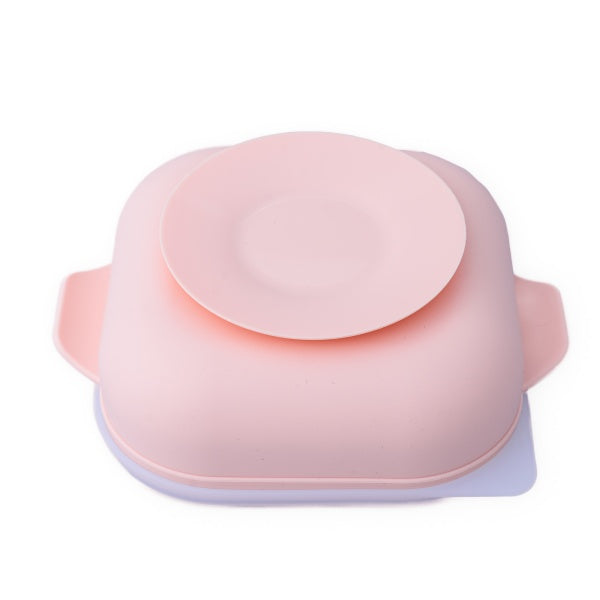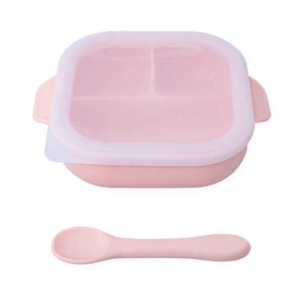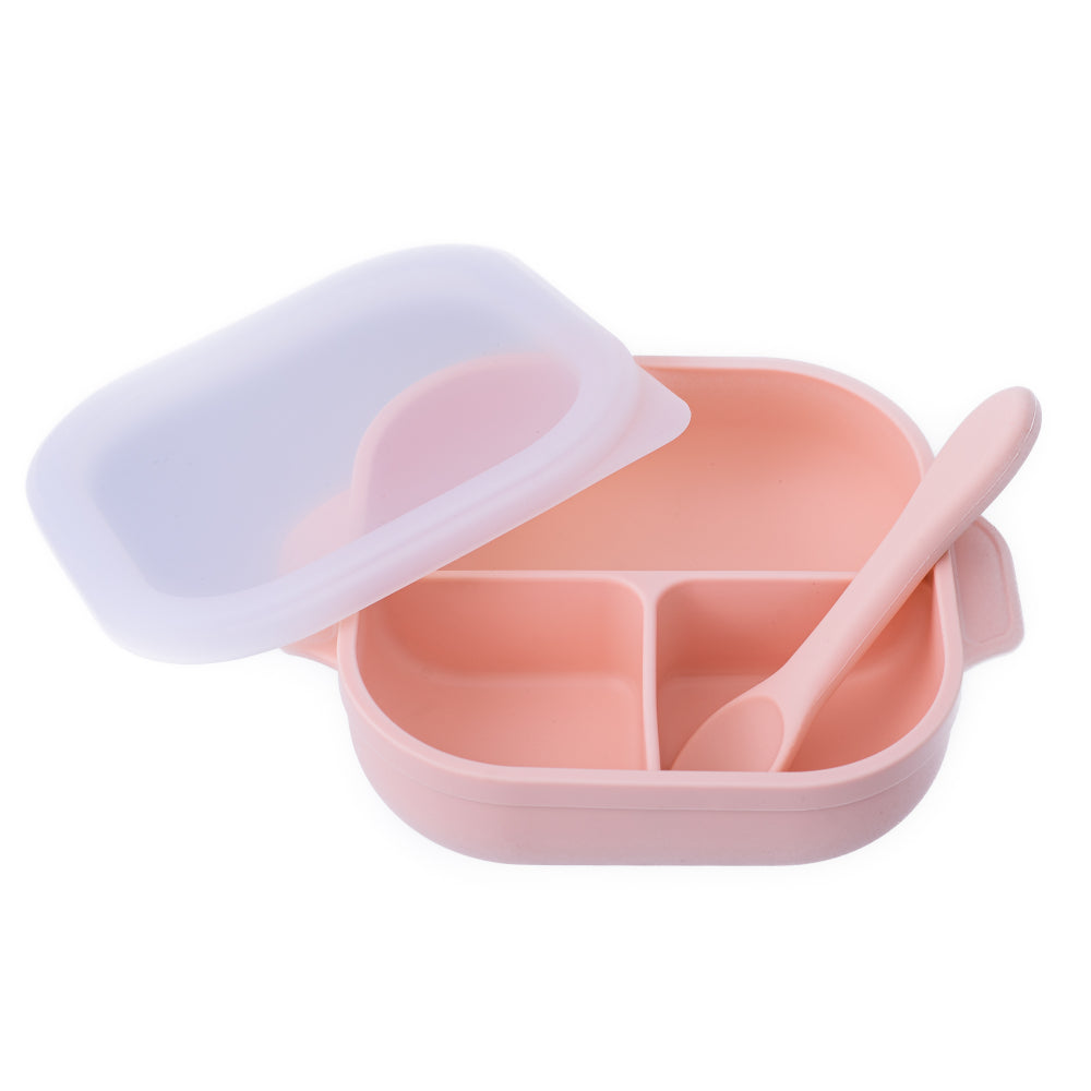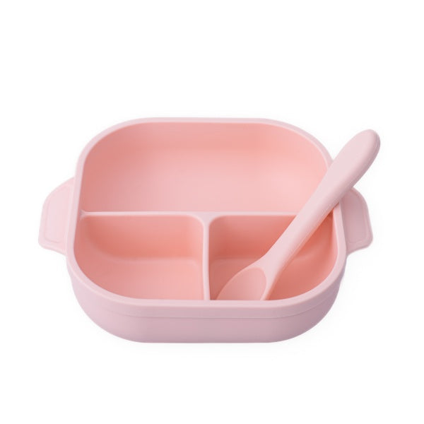 Set diversificare pentru copii - farfurie compartimentată cu ventuză, capac și linguriță din silicon Oaki Roz pal