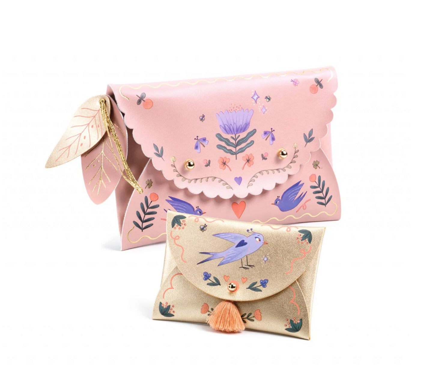 Un kit creativ pentru realizarea unui set de poșetă și portmoneu asortate, din piele artificială. Folosind un creion, copiii răzuiesc autocolantele pentru a le transfera pe poșete: pot urma sugestiile furnizate sau pot crea propriile modele. Apoi, ei asamblează fiecare portmoneu folosind închizătorile cu șurub și adaugă pomponul, cureaua pentru încheietura mâinii și decorațiunile frumoase din piele artificială. Vor fi atât de mândri de noile lor accesorii de modă!