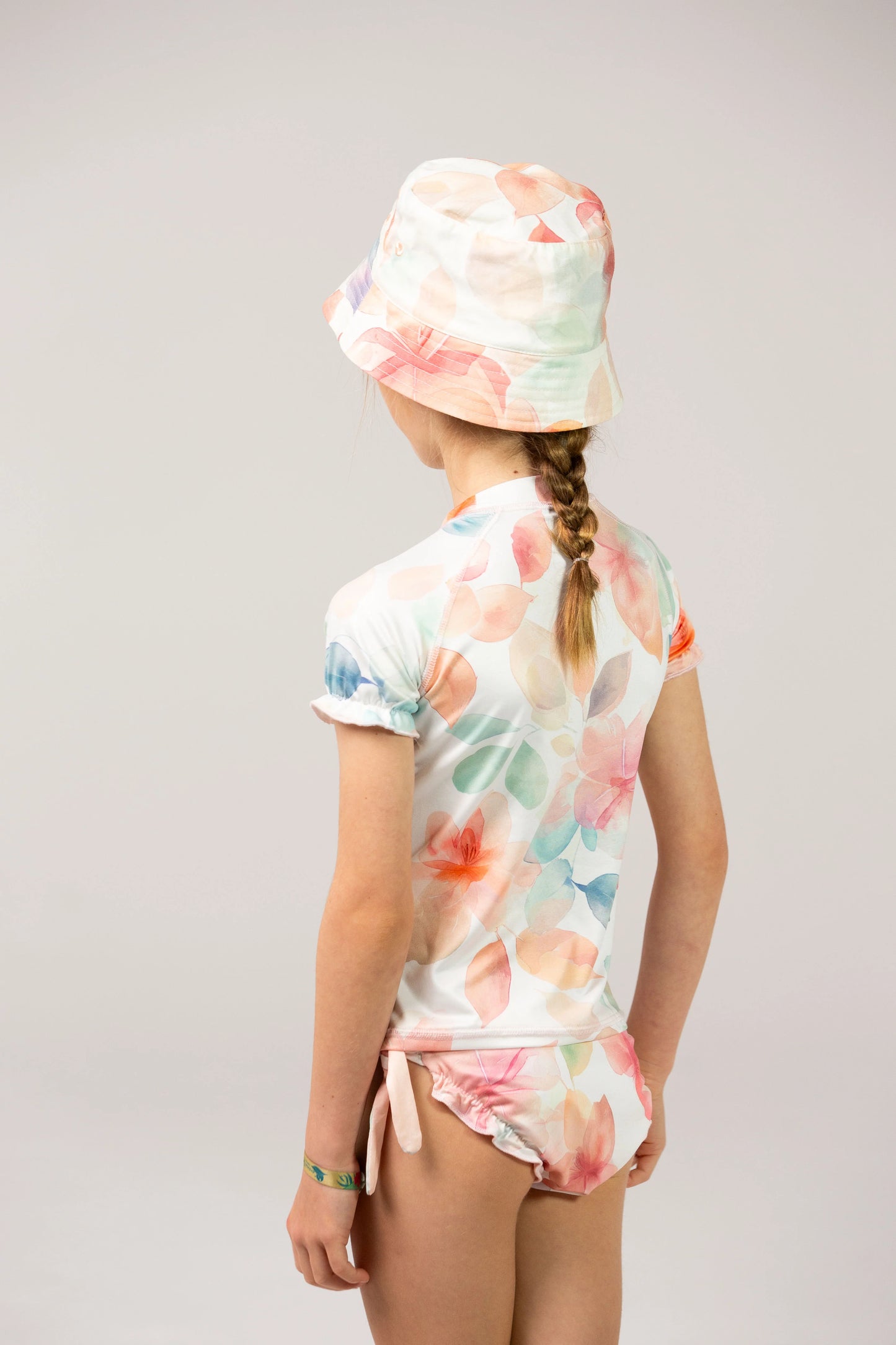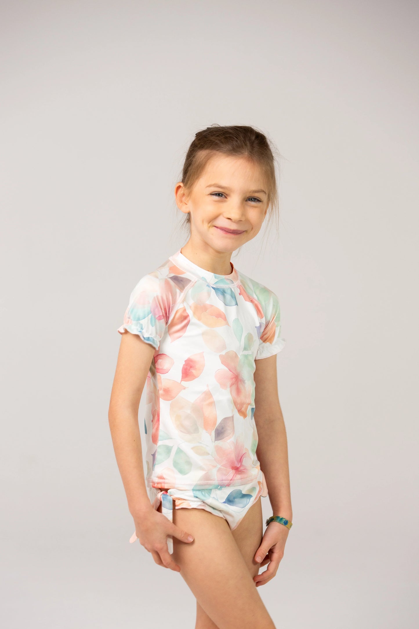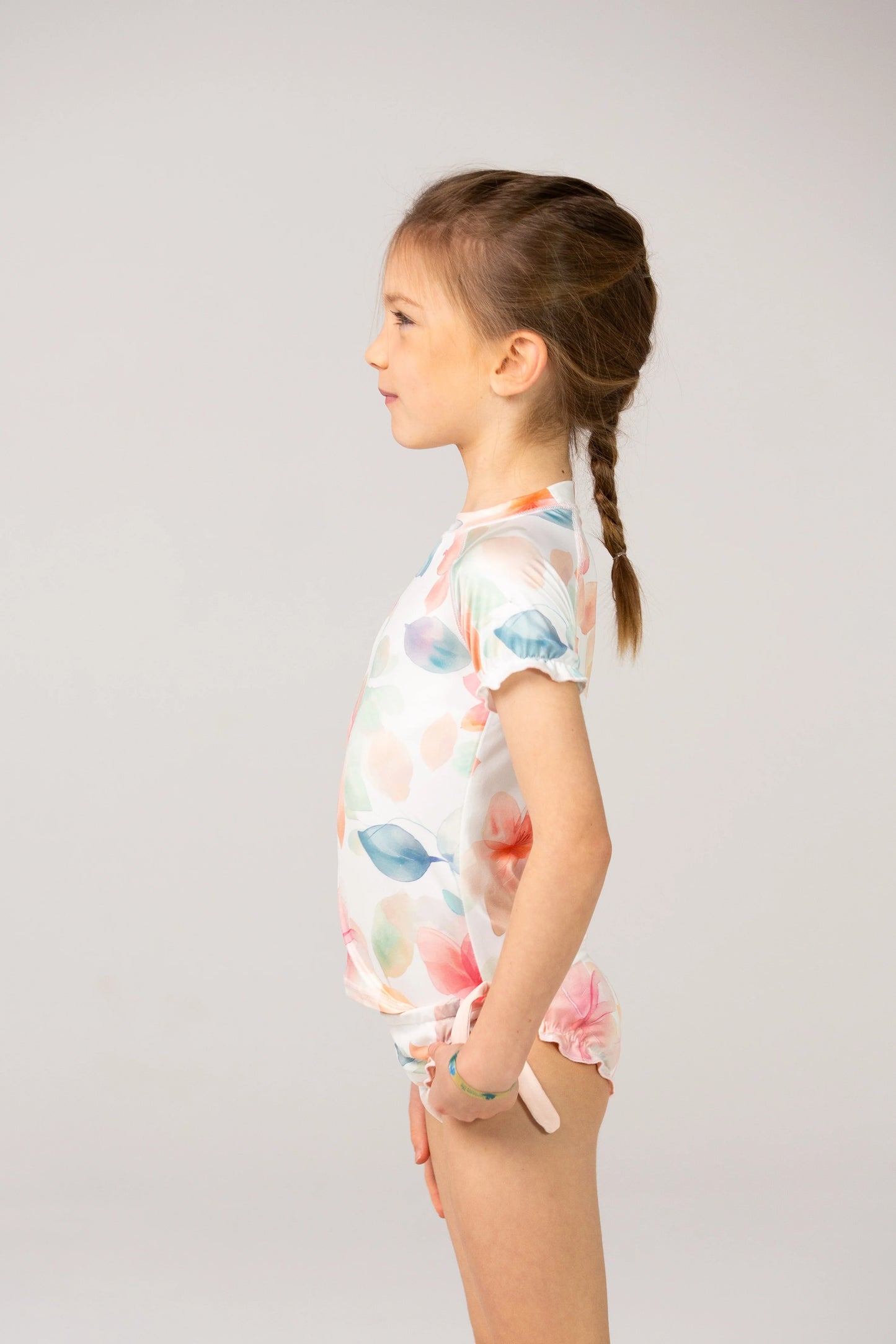 Model NOU de la Ducksday! Bikini reversibili și tricou cu mânecă scurtă, într-un print superb și cu protecție solară generoasă. Setul conține un tricou cu mânecă scurtă și o pereche de slipi de baie tip bikini cu două fete.