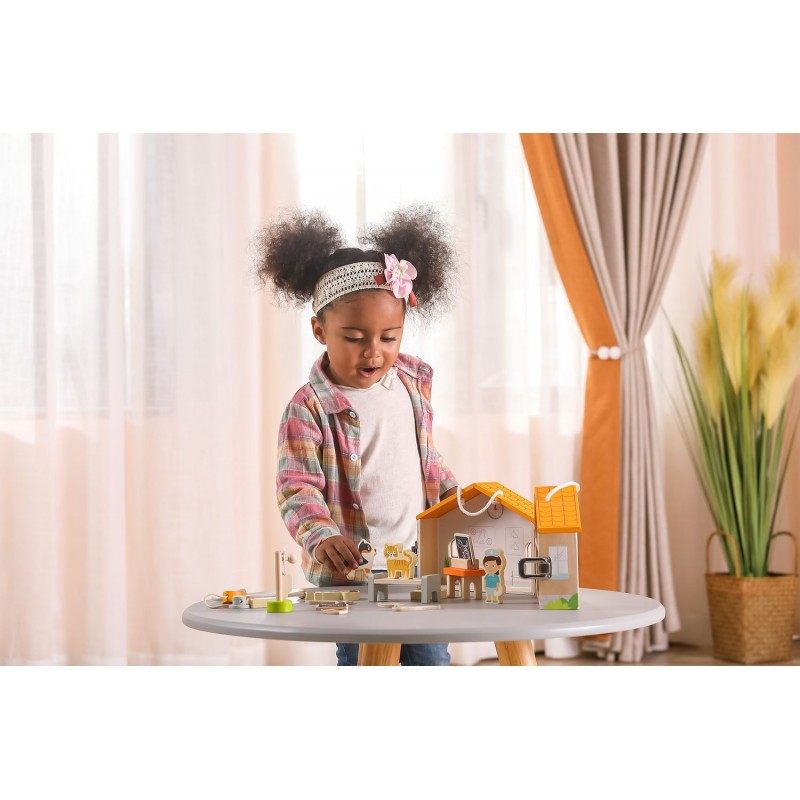 Set pentru joc de rol "La veterinar". Setul include 19 piese: medic veterinar, asistenta, seringa, pieptene, termometru, stetoscop, mancare pentru catei si alte accesorii. Toate piesele incap in casuta mobila, usor de montat si transportat. Catelusul bolnav trebuie consultat, pisica trebuie ingrijita... copiii pot crea nenumarate scene. Jocul de rol "La veterinar" ii ajuta pe cei mici sa devina responsabili si sa invete cum sa aiba grija de propriile animale de companie. De asemenea, le este cultivata dragostea pentru animale. Jocul dezvolta abilitatile sociale si motricitatea. Jucarie educativa din lemn, Montessori. Dimensiuni: 24 X 17.5 X 13 cm.
