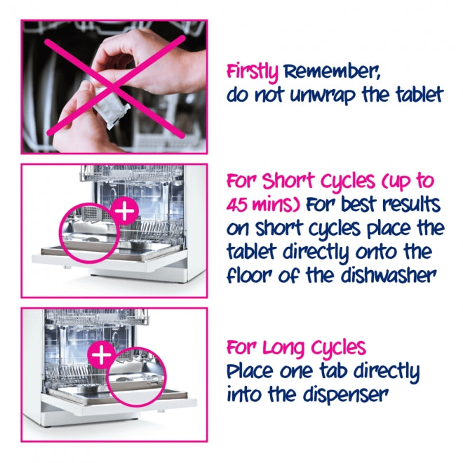 - Cicluri scurte (50 de minute sau mai puțin) - desfaceți și puneți tabletă direct în partea de jos a mașinii de spălat vase.