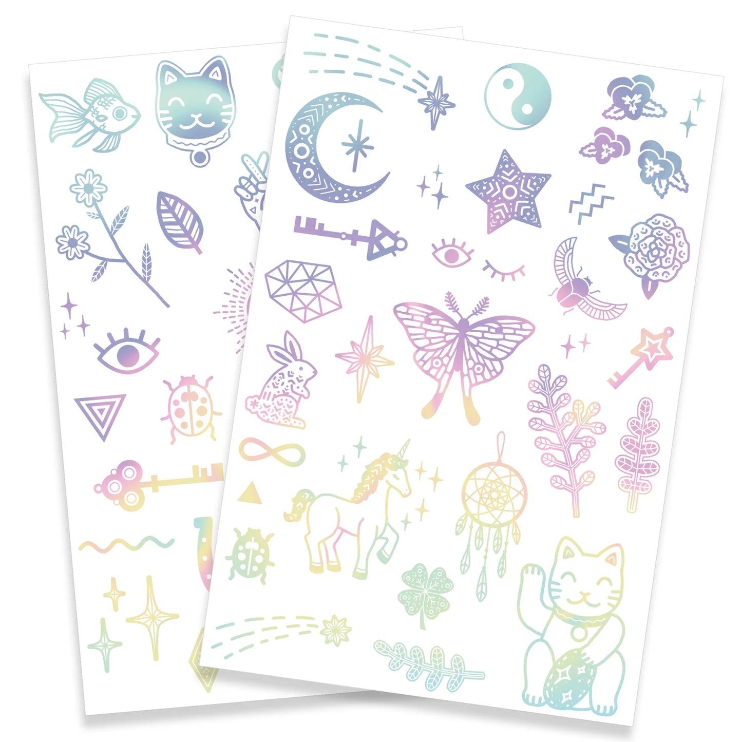Două foi cu tatuaje temporare. Tatuajele sunt pre-tăiate pentru a fi ușor de utilizat și transferat, folosind puțină apă.