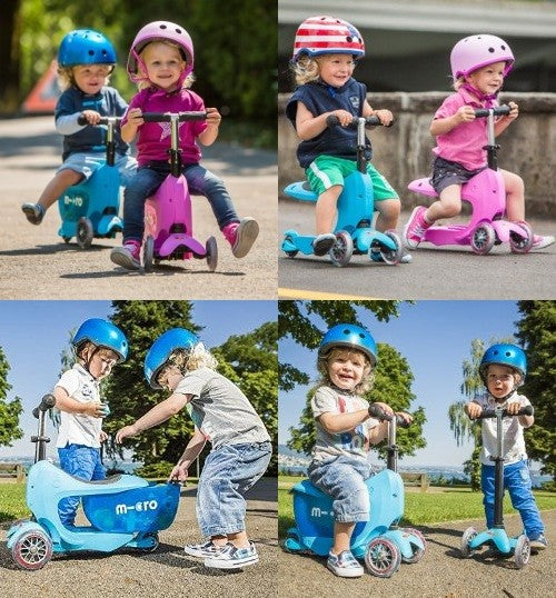 Mini2go este încă o inovație a designerilor elvețieni destinată copiilor începând cu vârsta de 18 luni. Când copilul este mic, el va sta confortabil pe scăunelul ergonomic și va înainta împingând cu piciorușele. Își va îmbunătăți echilibrul și abilitățile de coordonare. Sub scăunel se află un sertar detașabil în care pot fi depozitate jucăriile preferate sau produse alimentare. Sertarul poate fi scos si introdus la loc foarte ușor, chiar și de către copil. După ce copilul a crescut scăunul și sertarul se scot și obținem o trotinetă clasică Mini Micro, care poate fi folosită până la vârsta de 6-7 ani. Ghidonul este telescopic, reglabil pe înălțime, fiind lăsat la minim în primă fază, iar apoi ajustat în funcție de înălțimea copilului.