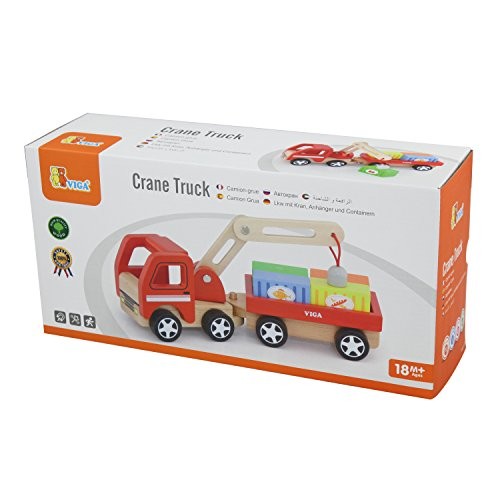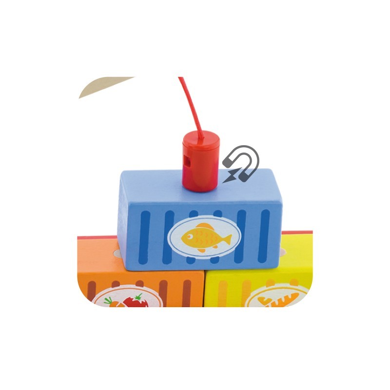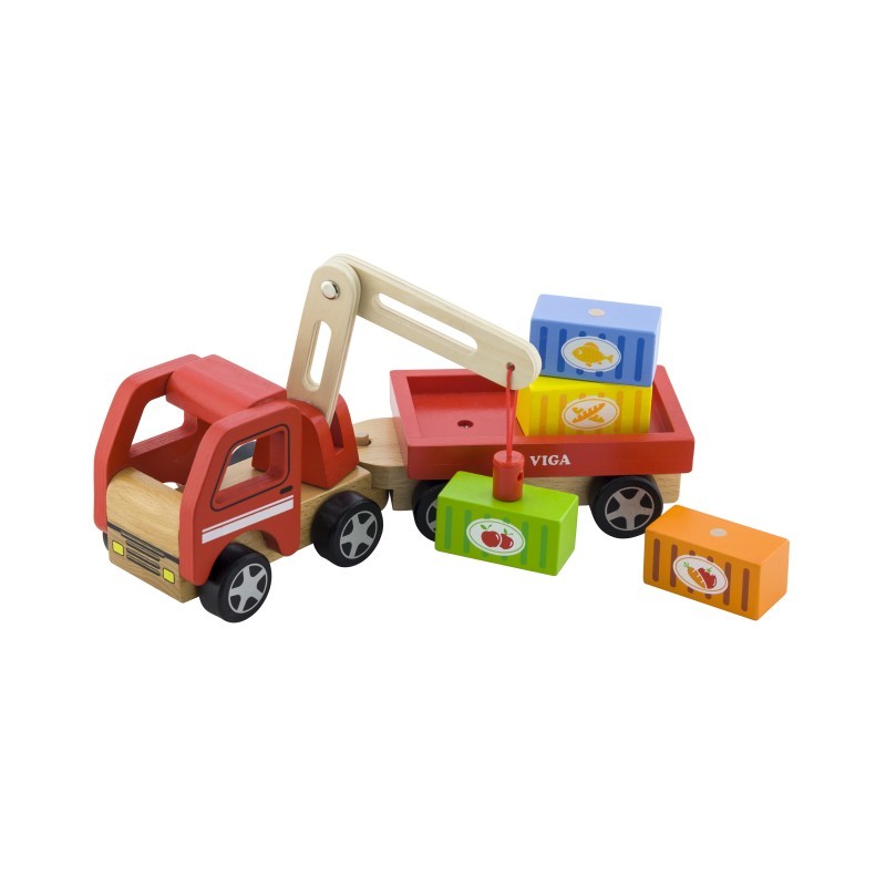 Acest frumos camion cu macara din lemn conține patru containere care pot fi ridicate cu ajutorul bratului magnetic. Suportul macaralei se poate roti si bratul se poate deplasa perfect in sus si in jos. Conectati remorca la transportatorul de marfa pentru a ridica cu magnetul din varf cate un container, apoi descarcati-l pe fiecare la destinație. Copiii iubitori de camioane vor fi incantati sa descopere posibilitati nelimitate de joc. Jucariile sunt ideale pentru dezvoltarea miscarilor fine, a coordonarii ochi-mana, dezvoltarea imaginatiei si a creativitatii.