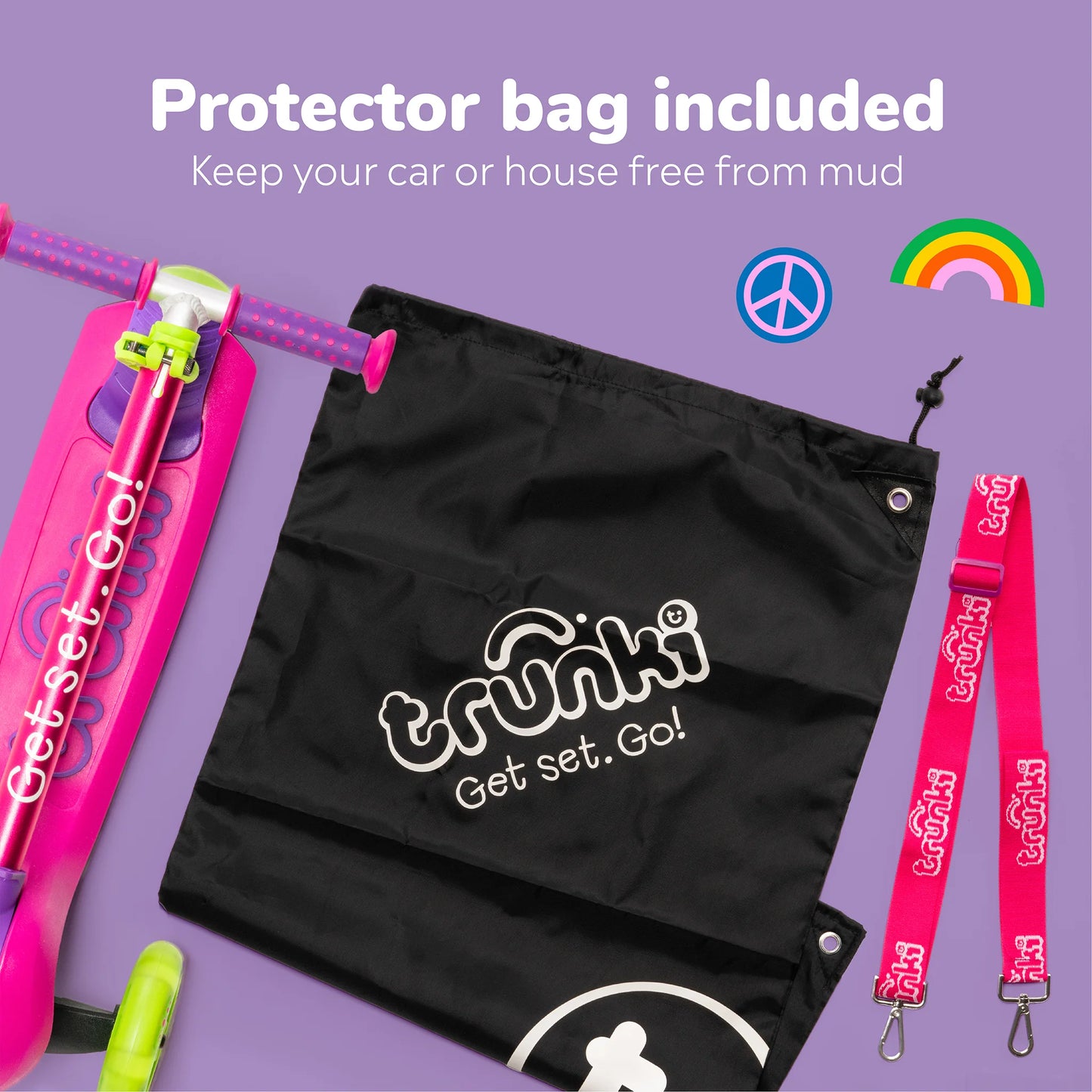Ghidonul pliabil îl face să fie ușor de depozitat și de transportat. Roata din spate si frâna late le permit celor mici să oprească și să controleze trotineta cu încredere. Ghidonul reglabil în înălțime face ca trotinetele Trunki să fie potrivite pentru un interval mare de vârstă.